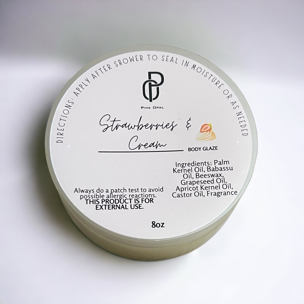 This body glaze smells like juicy strawberries with fresh sweet whipped cream.